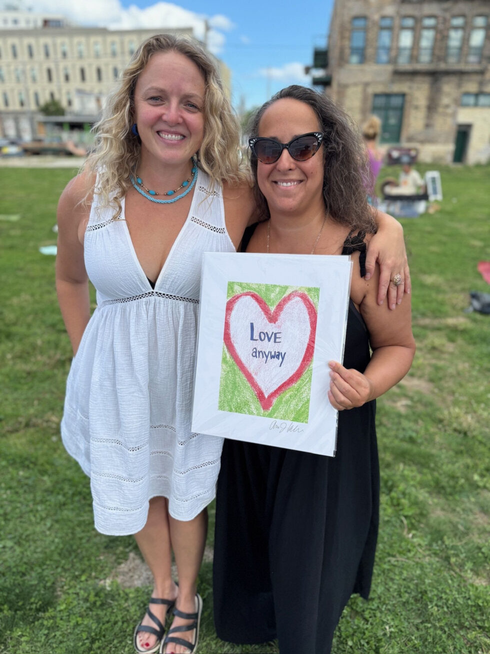 | Meeting Anne Koller This past weekend, I was in Milwaukee. I went to visit a friend and see a city I had never been to before. Saturday afternoon, she said, “Want to go to a sound bath?” My answer was, “Of course!” So we hopped in her car and headed over. It was not just a sound bath. There were mermaids, aerial performances, and stands offering a wide range of delights. My friend heads straight to a stand brimming with art featuring inspirational messages. She hugs the woman there and then introduces me. It’s Anne Koller, and all the art here is hers. One message – Love Anyway – catches my eye. It is on mugs and posters. It is on cards and shirts. I feel a tingle in my spine. This delights me! You may know that love is my secret ingredient (if you want to learn more about that, check out this video). I get really curious about what Love Anyway means to the artist, so I ask… |