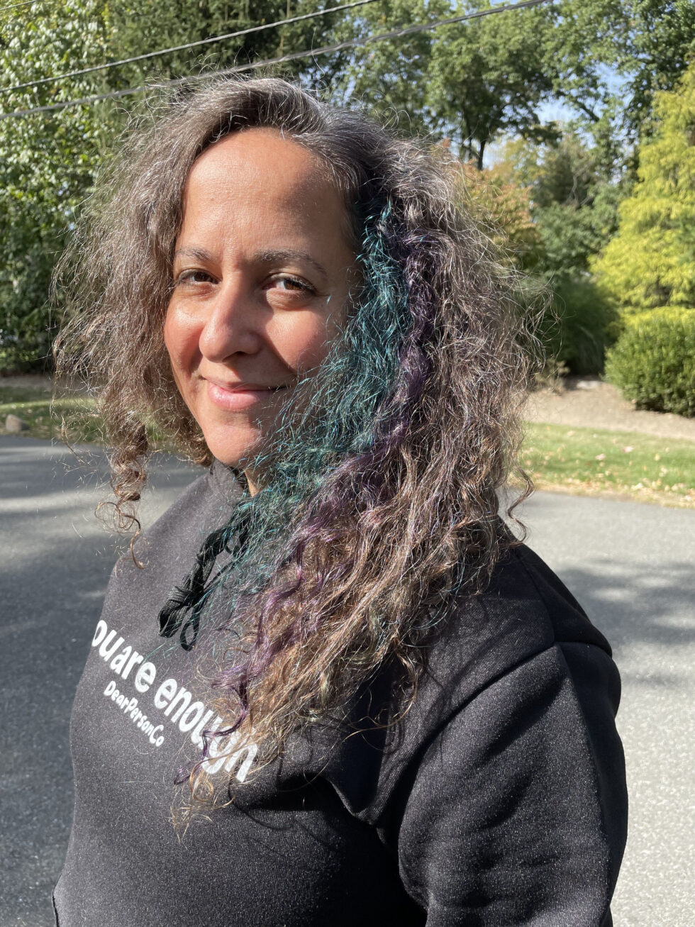 | I dyed my hair blue and purple last month! In our day-to-day lives, at least my day-to-day life, it wouldn’t feel right to be in full costume every day like people do on Halloween. Yet, there are ways I incorporate the idea of play and creativity into my appearance. Last spring, I went to New Orleans with a friend and wore rhinestones every day. Not rhinestone clothes, around my eyes. I loved having this bit of sparkle. Just a small step that felt right for vacation. A few weeks ago, I went to a family wedding and ended up with glitter in my hair. My mom did also 🙂 Again, another bit of play and joy for the celebration. Those are both examples of Halloween-type creativity that I have brought into my daily life. Not something that I do every day, but I have found moments when I can bring that sparkle forward. Recently, I took a step that was more permanent. I dyed my hair! I have never dyed my hair. Not to add highlights, not to cover my grey, not at all. Since 2020, my mom has been dyeing her hair. She has gorgeous silver hair. We started putting stripes of purple or turquoise in it. Yes, I do it for her. We set up a ‘beauty salon’ in the bathroom every couple of months. It is so fun. In September, as we were setting up, I said, “What if we do my hair also?” She looked at me with a huge smile and said, “SURE!” My hair is brown, with a sprinkling of grey. I didn’t bleach the brown and hoped that the color would simply hold onto the grey. Not knowing how this would come out, I decided to do a patch on the side. If I didn’t like it, I could just make sure to always part my hair to cover it. One section of turquoise and one section of purple. A few hours later, I rinsed out the dye and looked in the mirror. I realized this was an amazing decision! It brought such joy! This small action still brings me joy. In a world with so many hard things happening, it is important that we create these moments of levity, of play, of joy! |